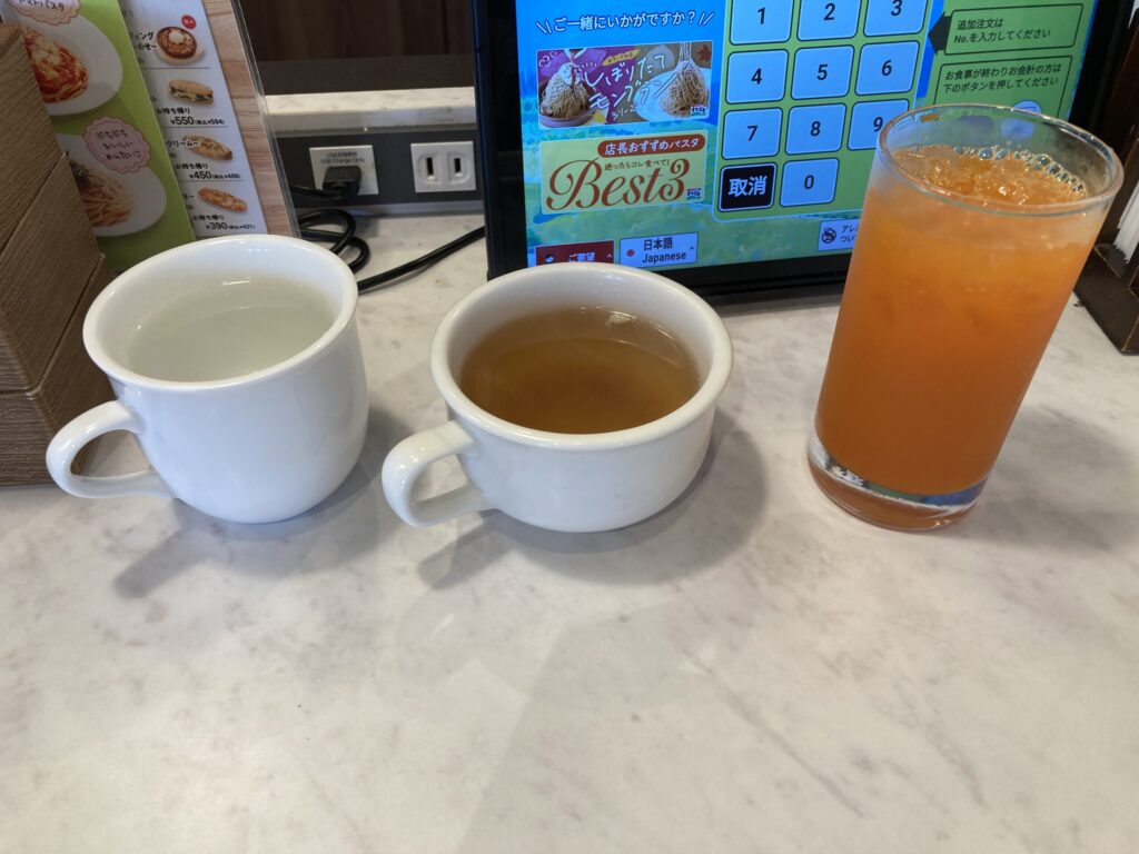 先ずはドリンクバーで野菜ジュースとスープをとった。