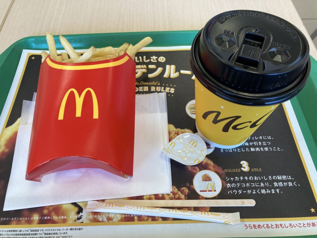 2025年11月6日はLポテチ250円なのでクーポンでホットコーヒーMを130円で注文した