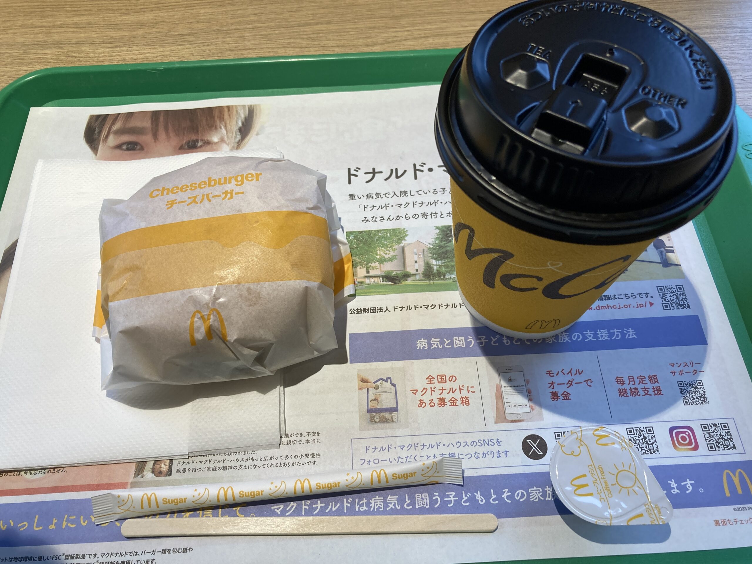 クーポンでポテチが無かったので仕方がないので、チーズバーガーにしました。