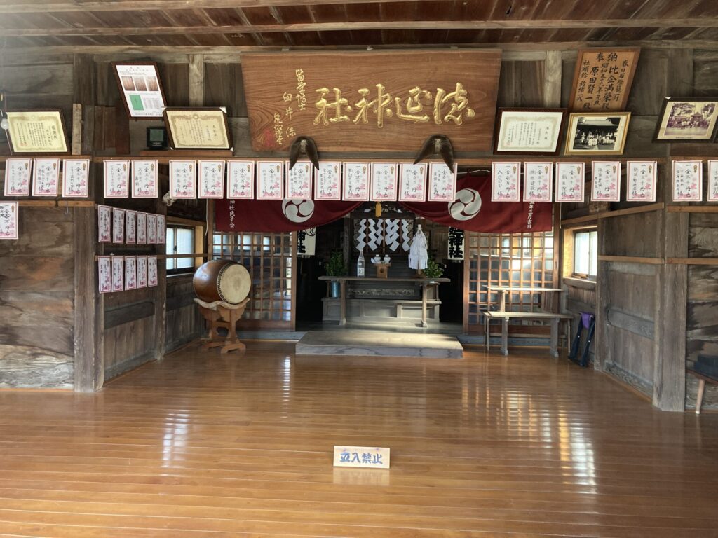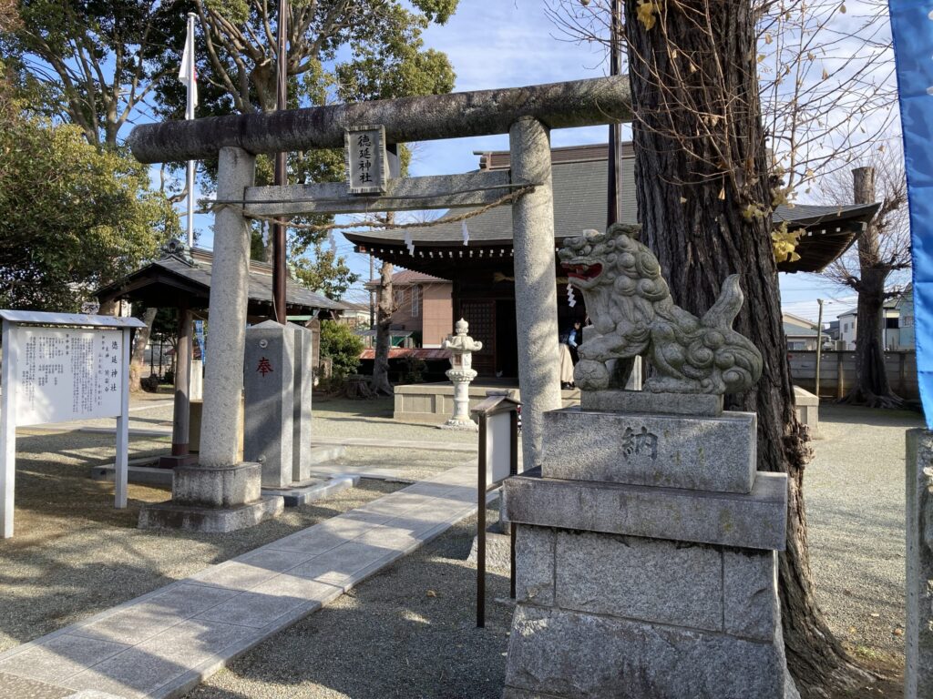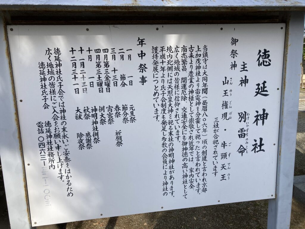 徳延神社の案内版があり1700年以上前に創建された徳延神社でかなりの歴史を感じます。