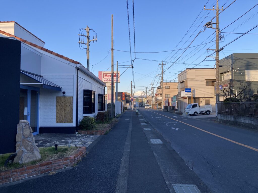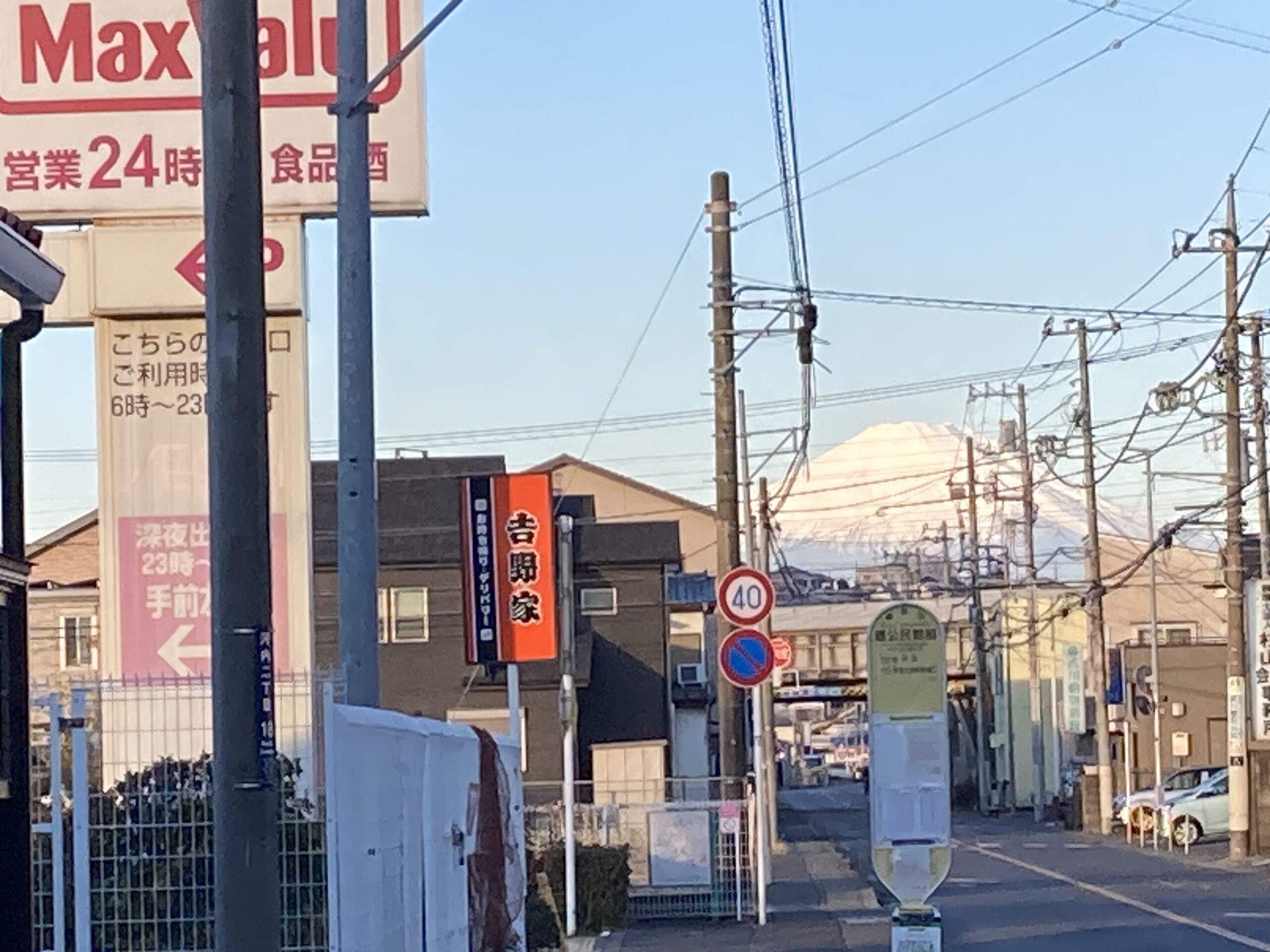 纒公民館前のバス停とマックスバリュー平塚河内の看板見ながら最大望遠で富士山を捕捉した。