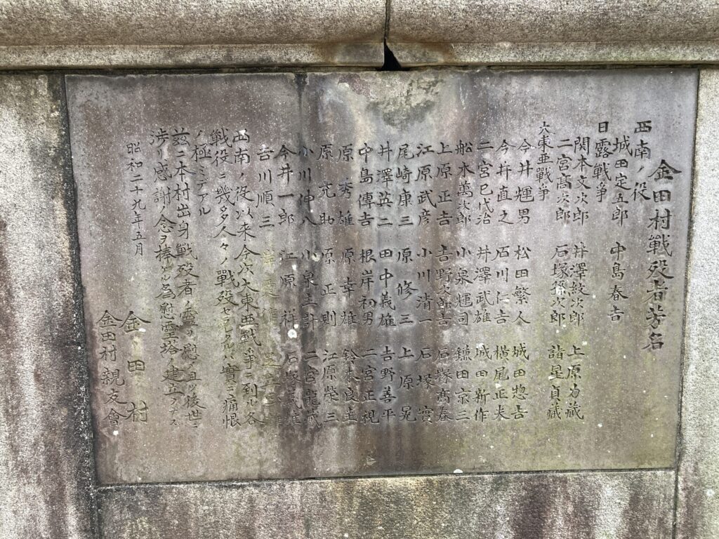 これは昔の金田村で戦地に赴き亡くなられた方々の慰霊を含んだ塔になります。