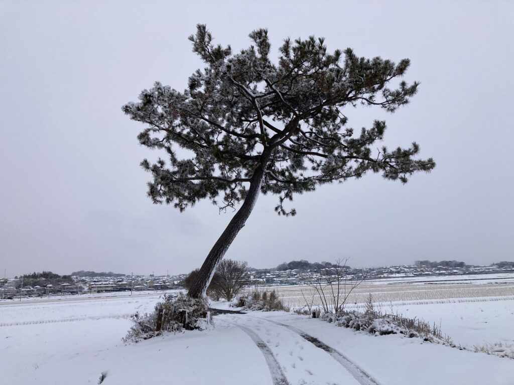 雪化粧した纒の控え土手の松をパチリした。