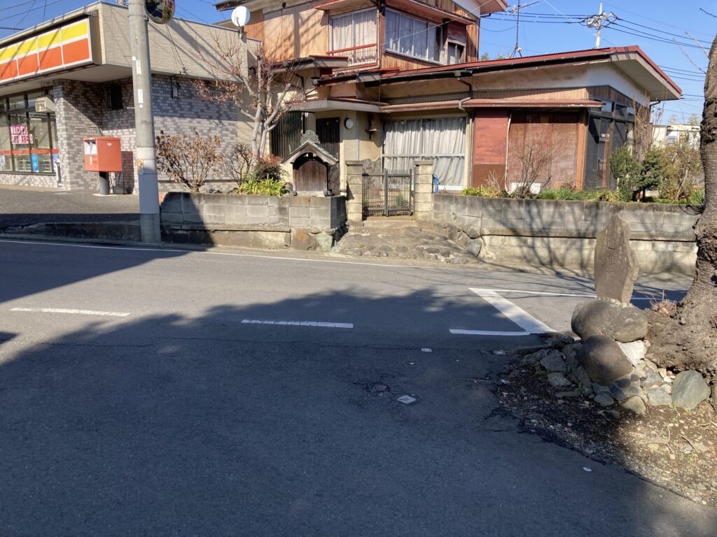 ピクチャーの左側にヤマザキがあり、右端に道祖神の石碑があります。