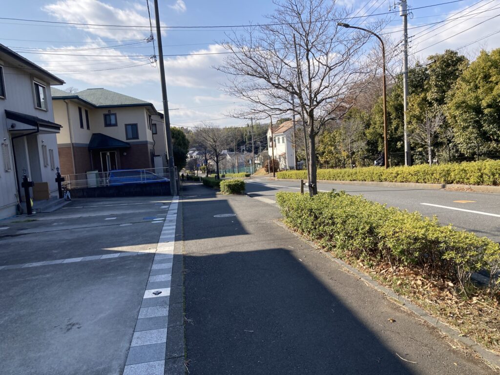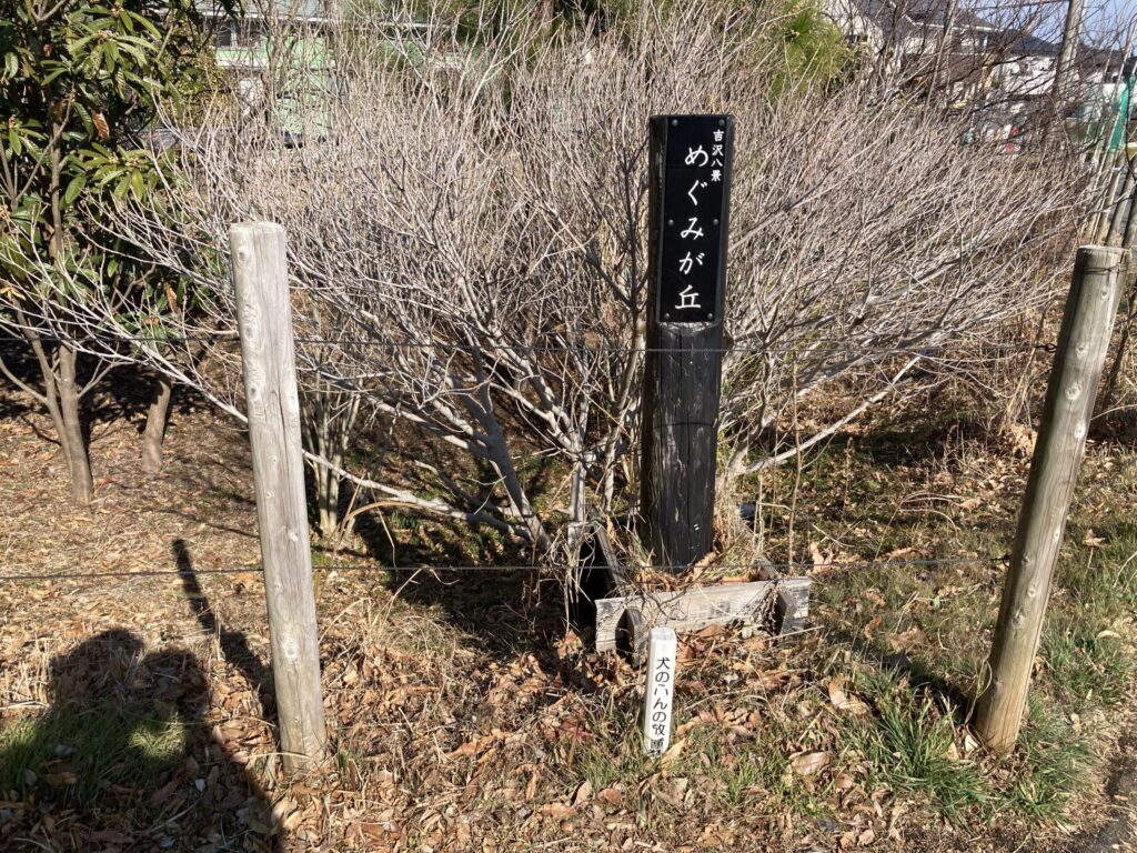 めぐみが丘の中央の歩道を歩きますよ、そのところには吉沢八景の1つめぐみが丘があります。
