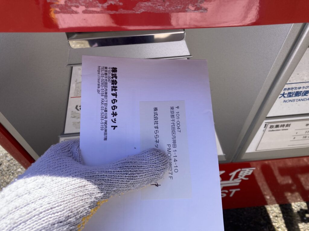 目的地向かい前に最初セブンイレブン纒の前のところにポストがあるのでそこに投函しました。