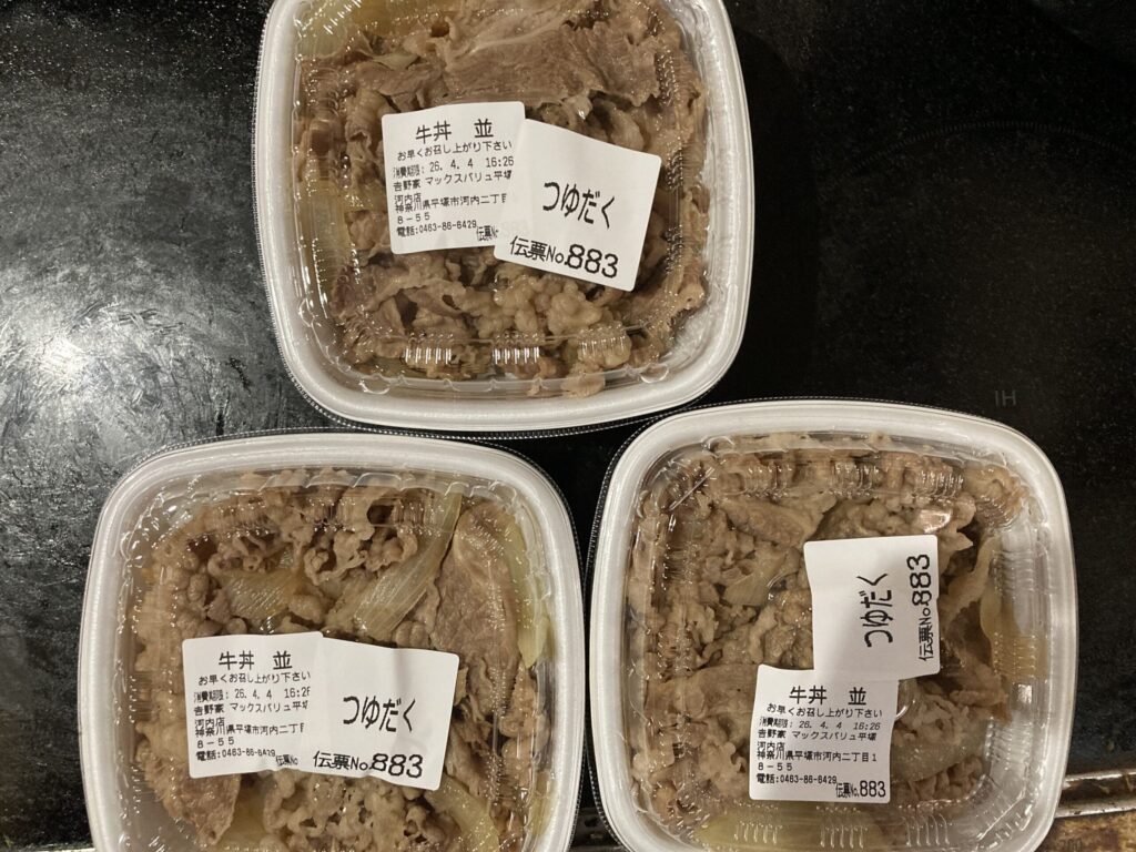 終わったら今度は夕飯の準備で吉野家平塚河内店まで戻って歩きました。