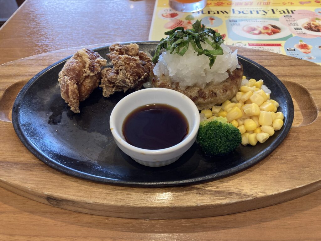 ハンバーグの上におろしがのっていて唐揚げが2ケありました。