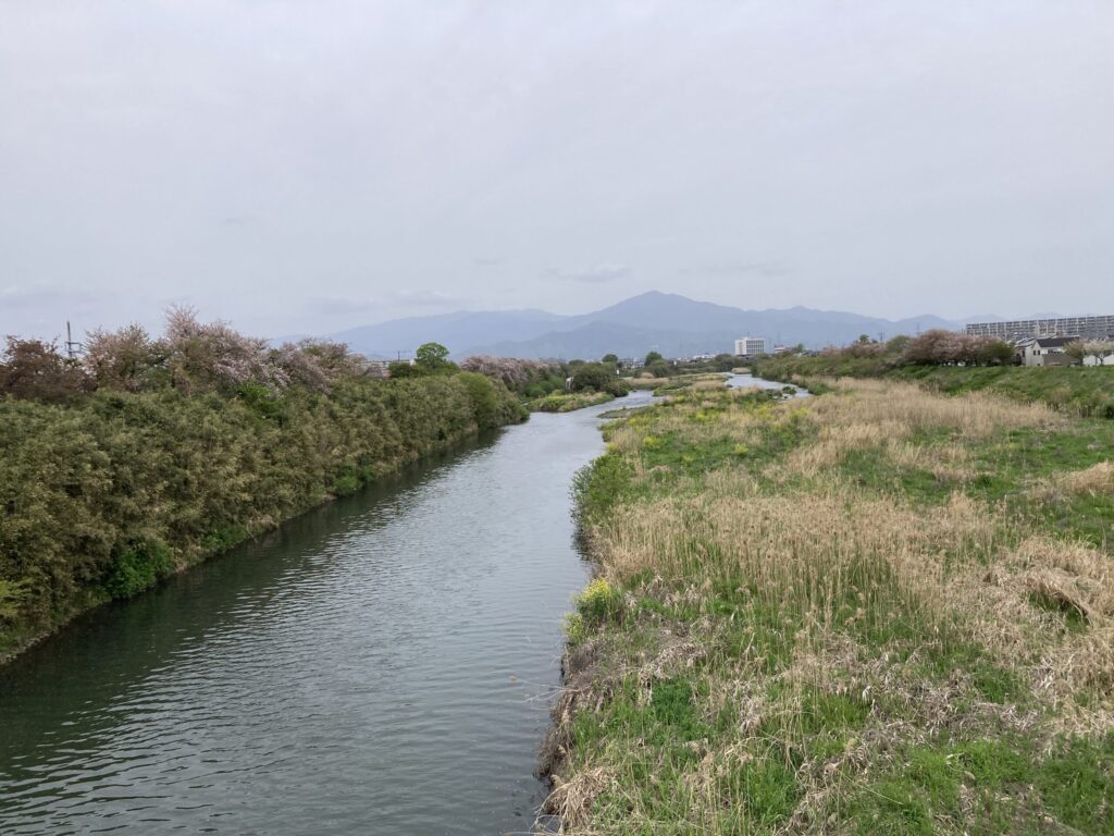 高麗大橋から金目川サイクリング道路の桜並木と大山をぱちりした。