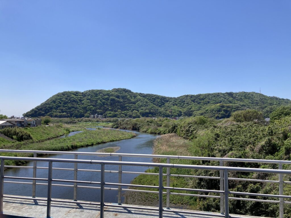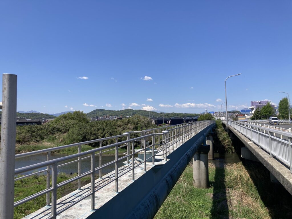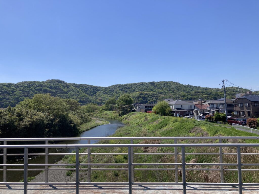 平塚大橋の上でいつものように金目川と湘南平もパチリした。