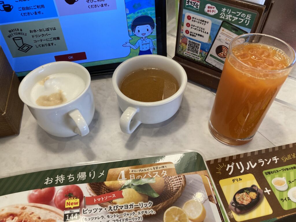 ピザを頼んで待っているのですが、ドリンクバーやスープバーでドリンク類をピックアップしてきました。