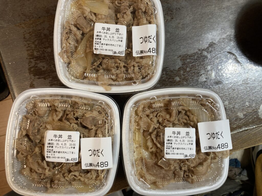 さらに夕飯の準備として吉野家の牛ドンを3個の割引を使用して購入しておきました。